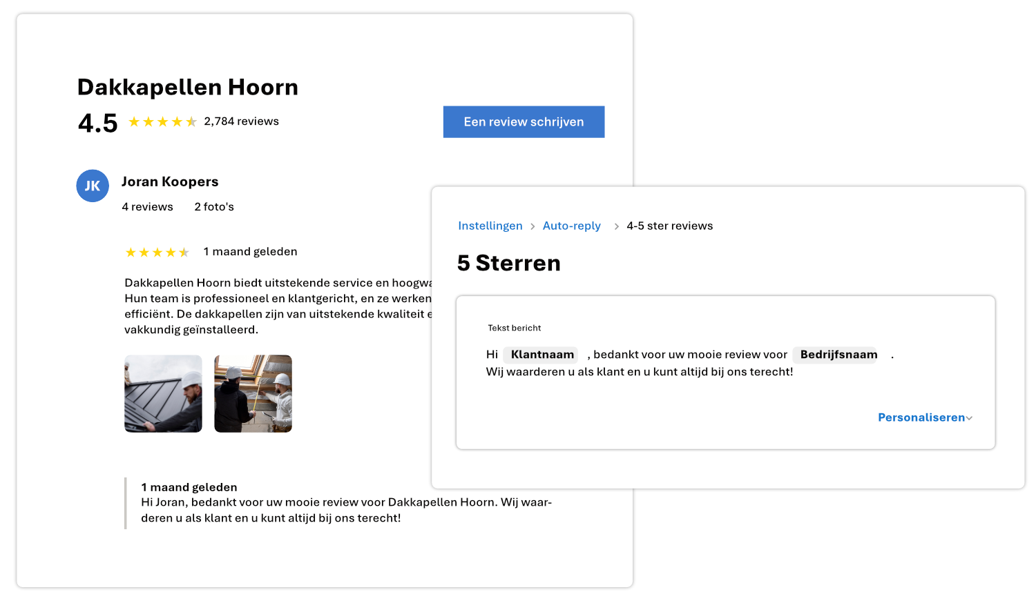 Beantwoord reviews met automatische gepersonaliseerde sjablonen.