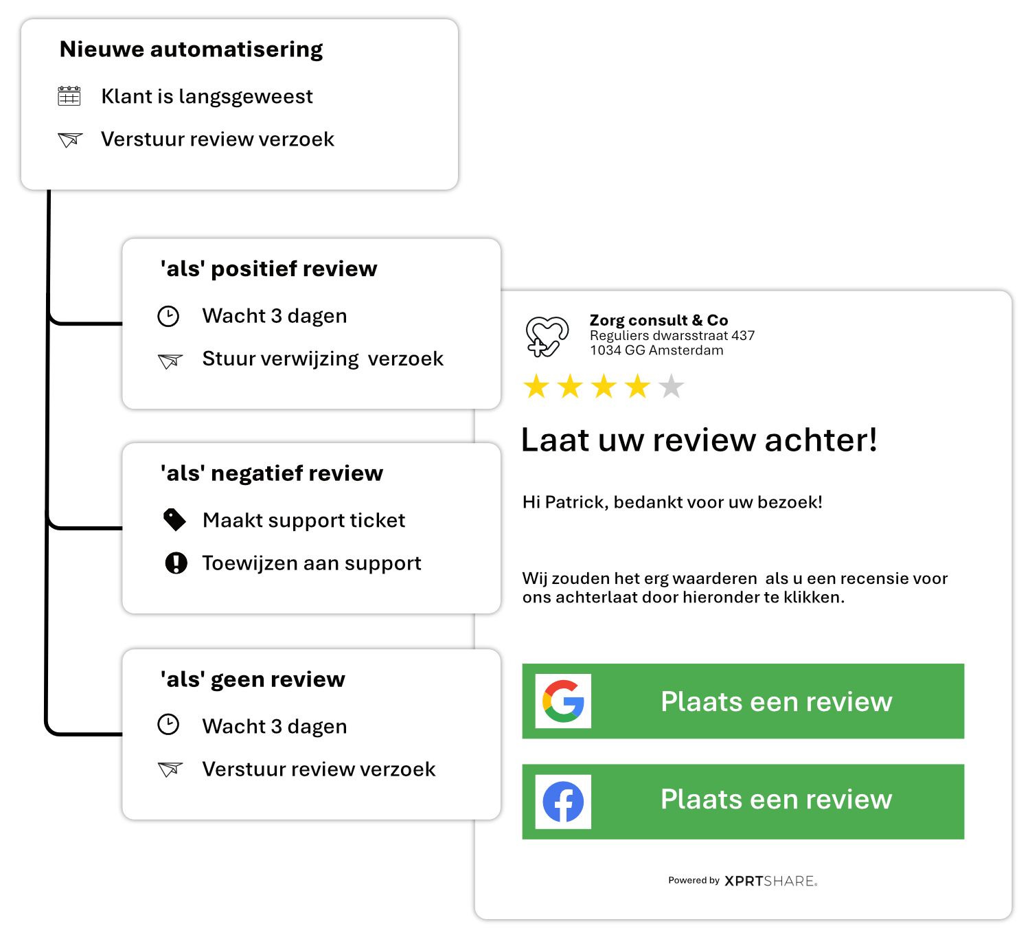 Verder zorgen automatische reviewverzoeken na elke afspraak of aankoop ervoor dat je nooit een kans mist om je reputatie te verbeteren.